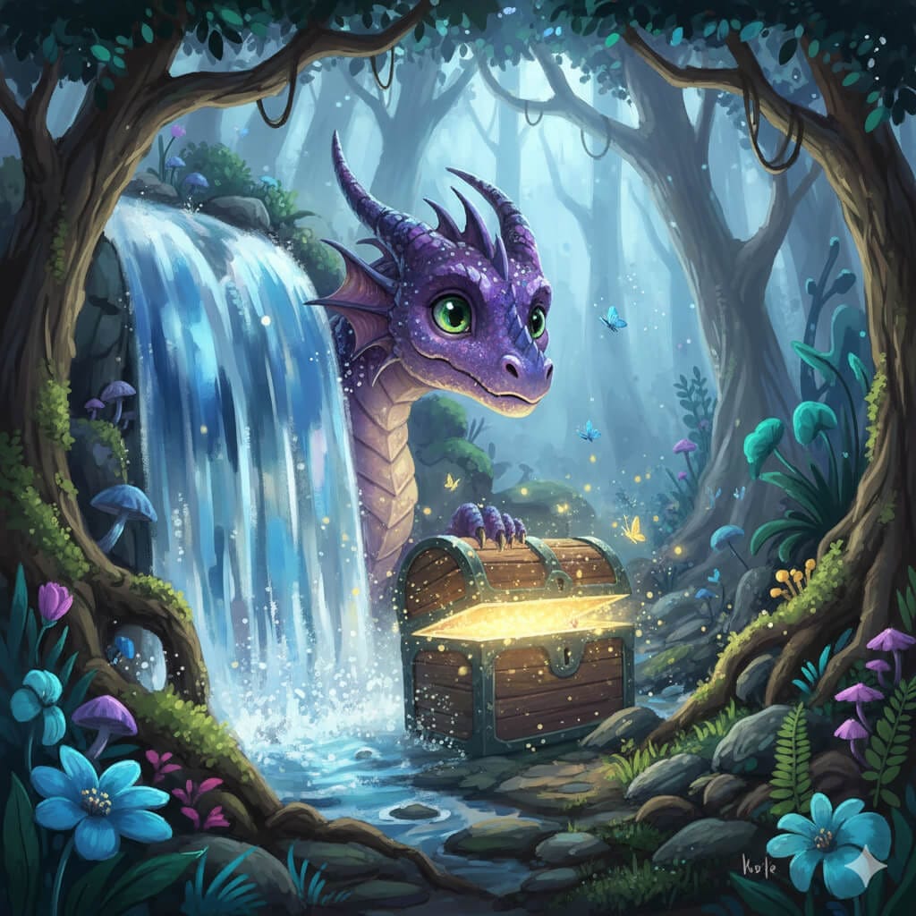 - A curious young dragon with sparkly purple scales discovers a glowing, hidden treasure chest behind a waterfall in an enchanted forest.