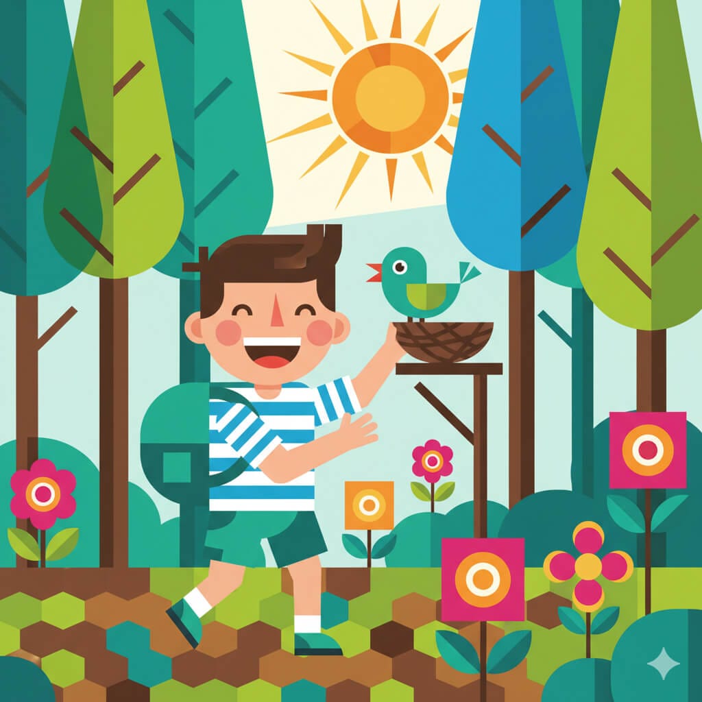 1) A smiling young boy helping a bird find its nest in a vibrant forest with an angular-shaped sun peeking through the trees. Simplified geometric illustration style.