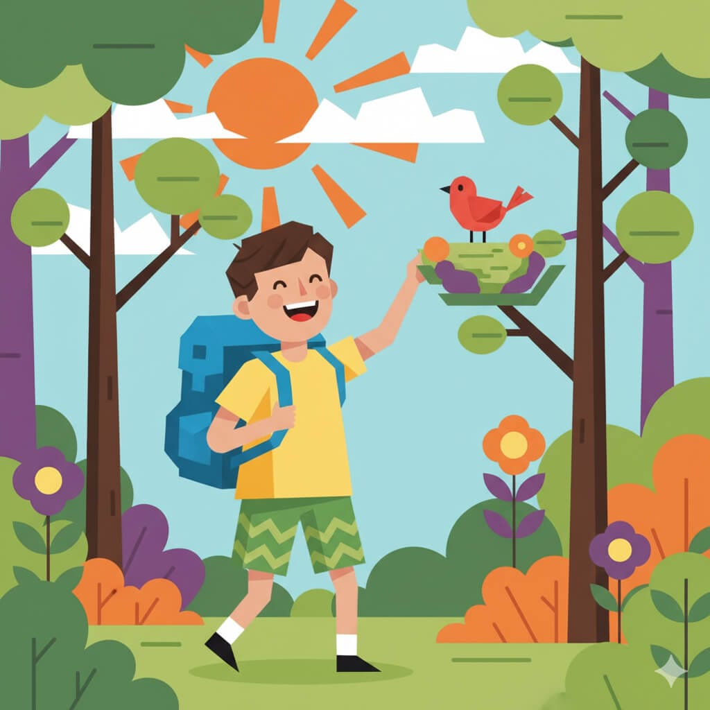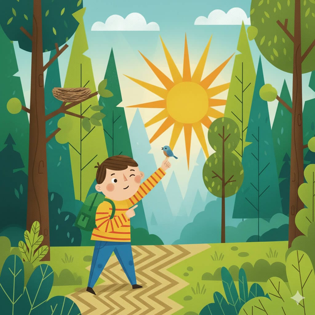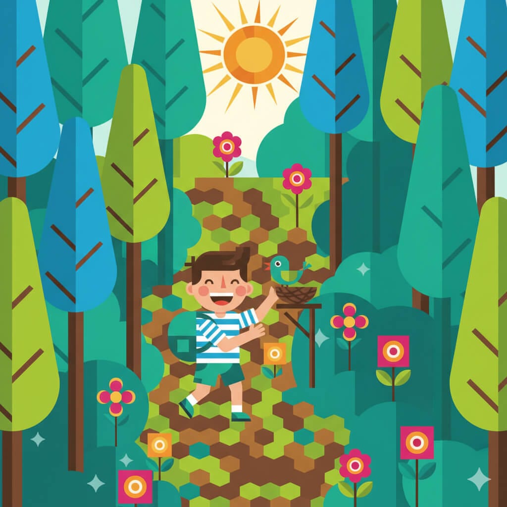 - A smiling young boy helping a bird find its nest in a vibrant forest with an angular-shaped sun peeking through the trees.