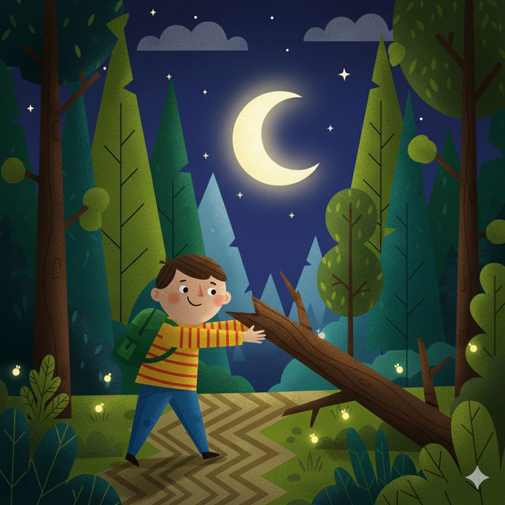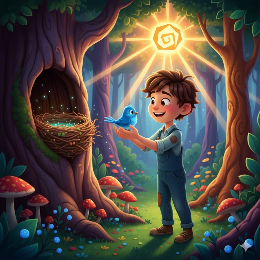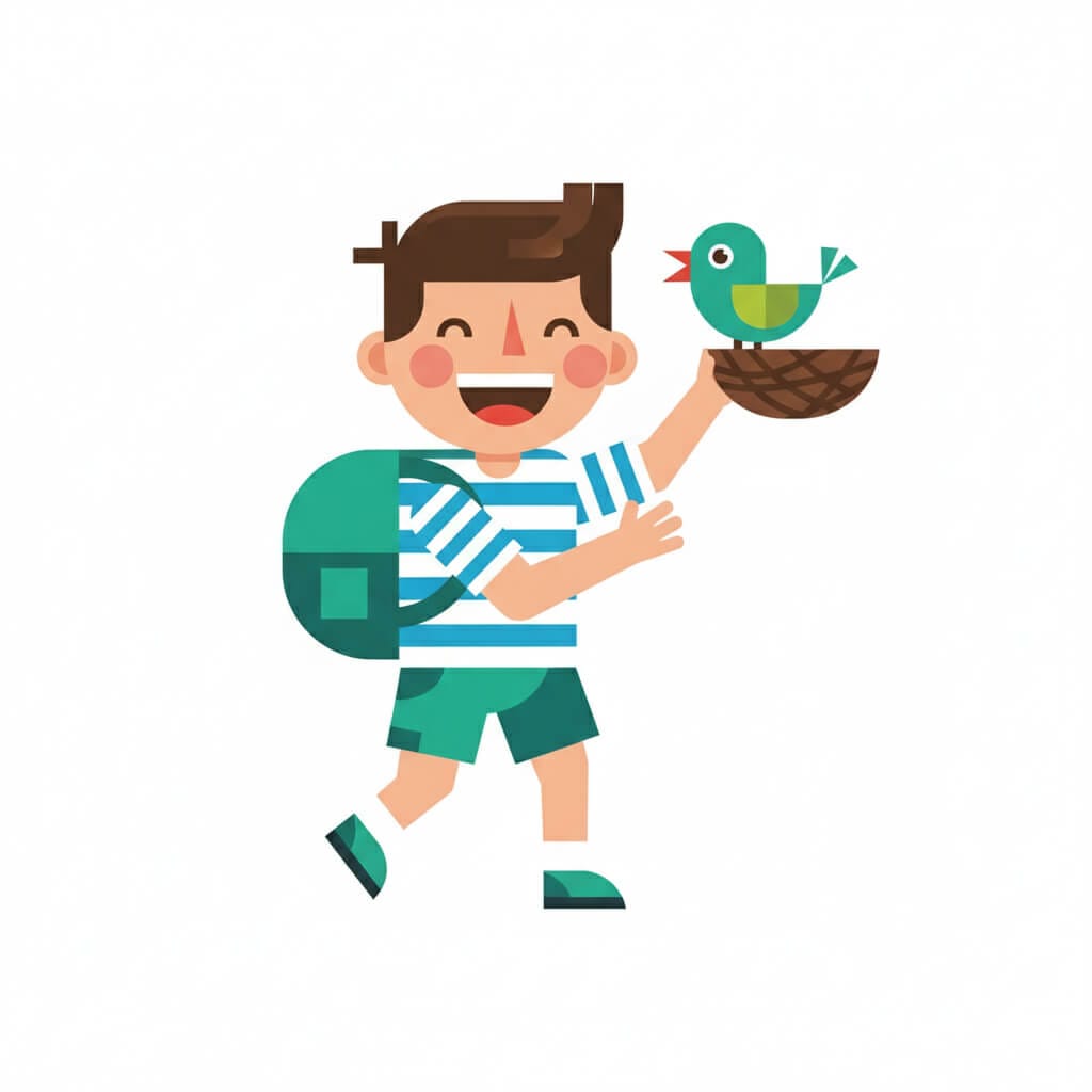 - A smiling young boy helping a bird find its nest in a vibrant forest with an angular-shaped sun peeking through the trees.