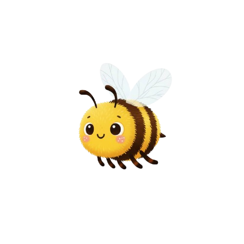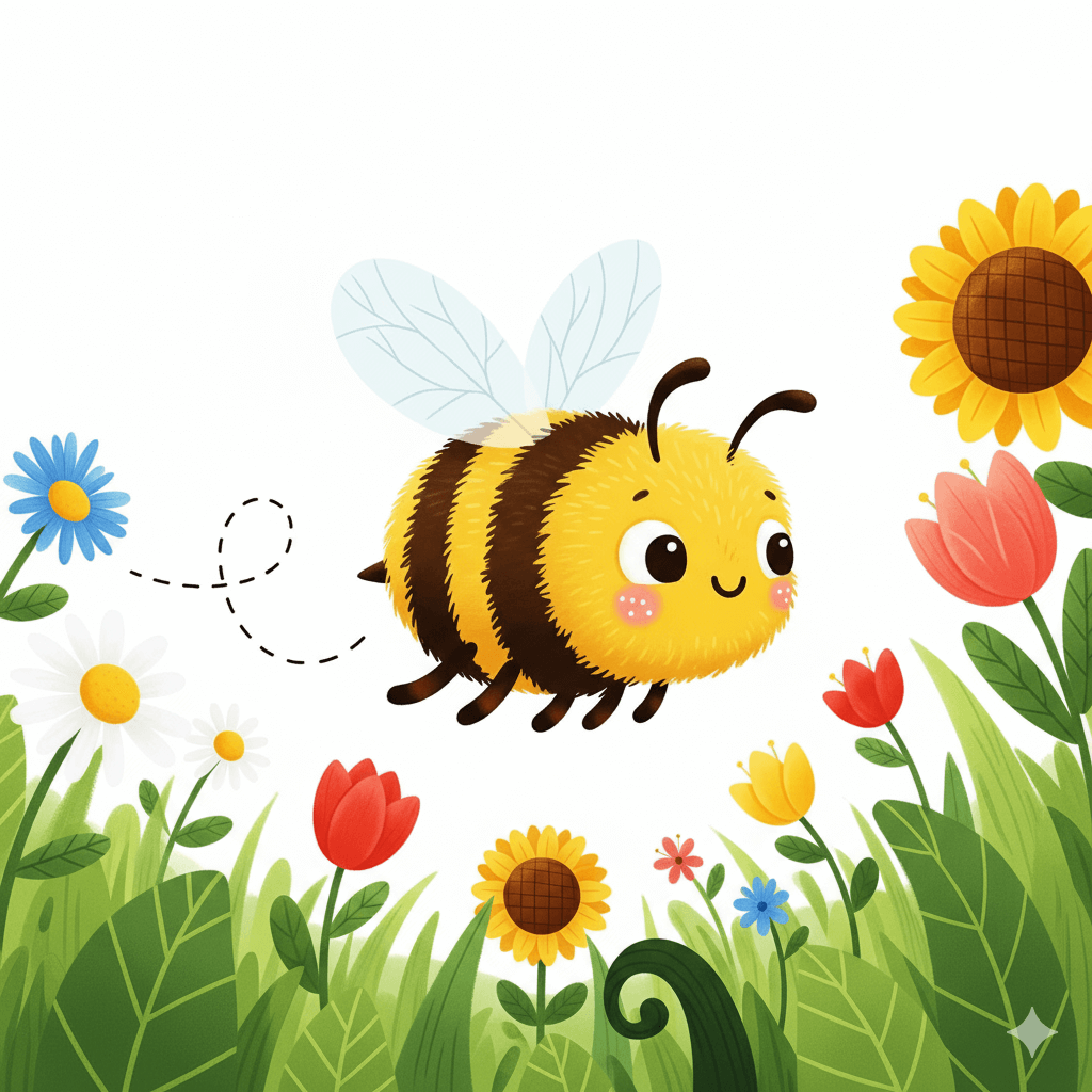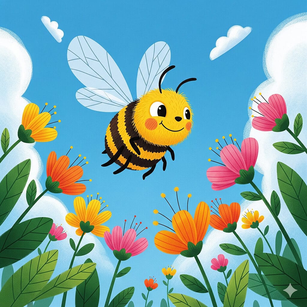 2) A happy little bee flying from flower to flower in a sunny garden. Shown in a cheerful low angle, looking up at the bee against the bright sky.