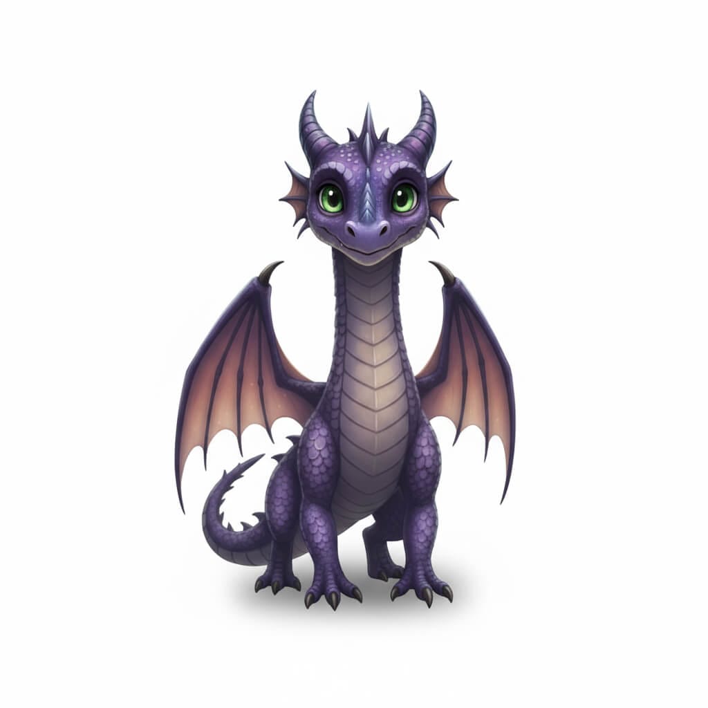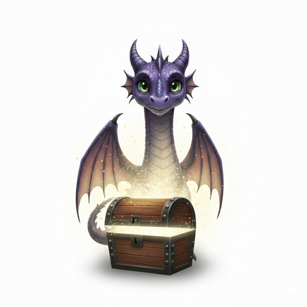 - A curious young dragon with sparkly purple scales discovers a glowing, hidden treasure chest