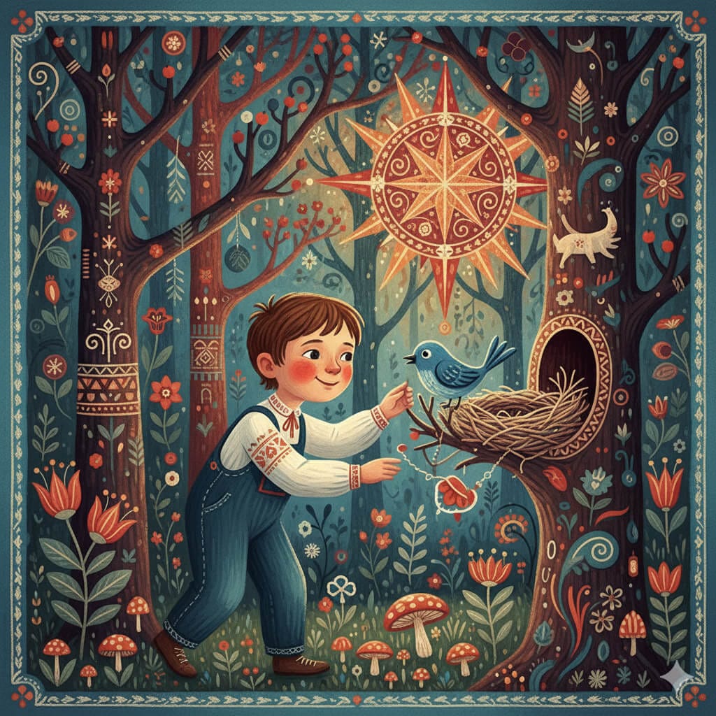 3) A smiling young boy helping a bird find its nest in a vibrant forest with an angular-shaped sun peeking through the trees. Scandinavian folk art style.