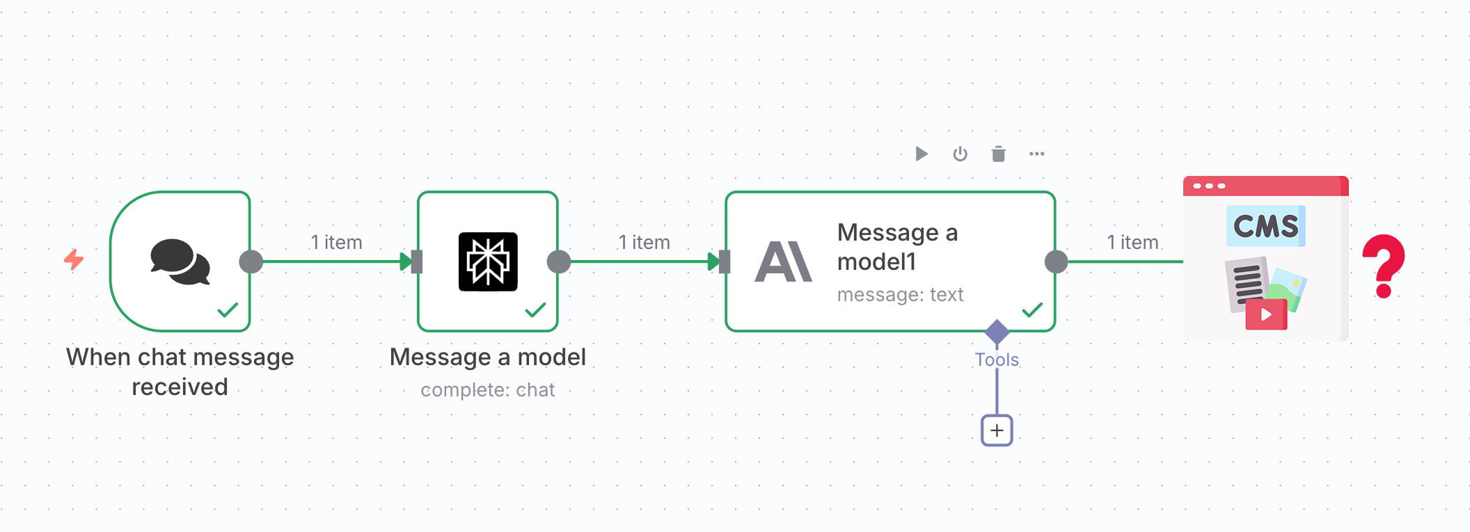 Inside n8n, each step of a workflow is performed by adding a node to the automation pipeline