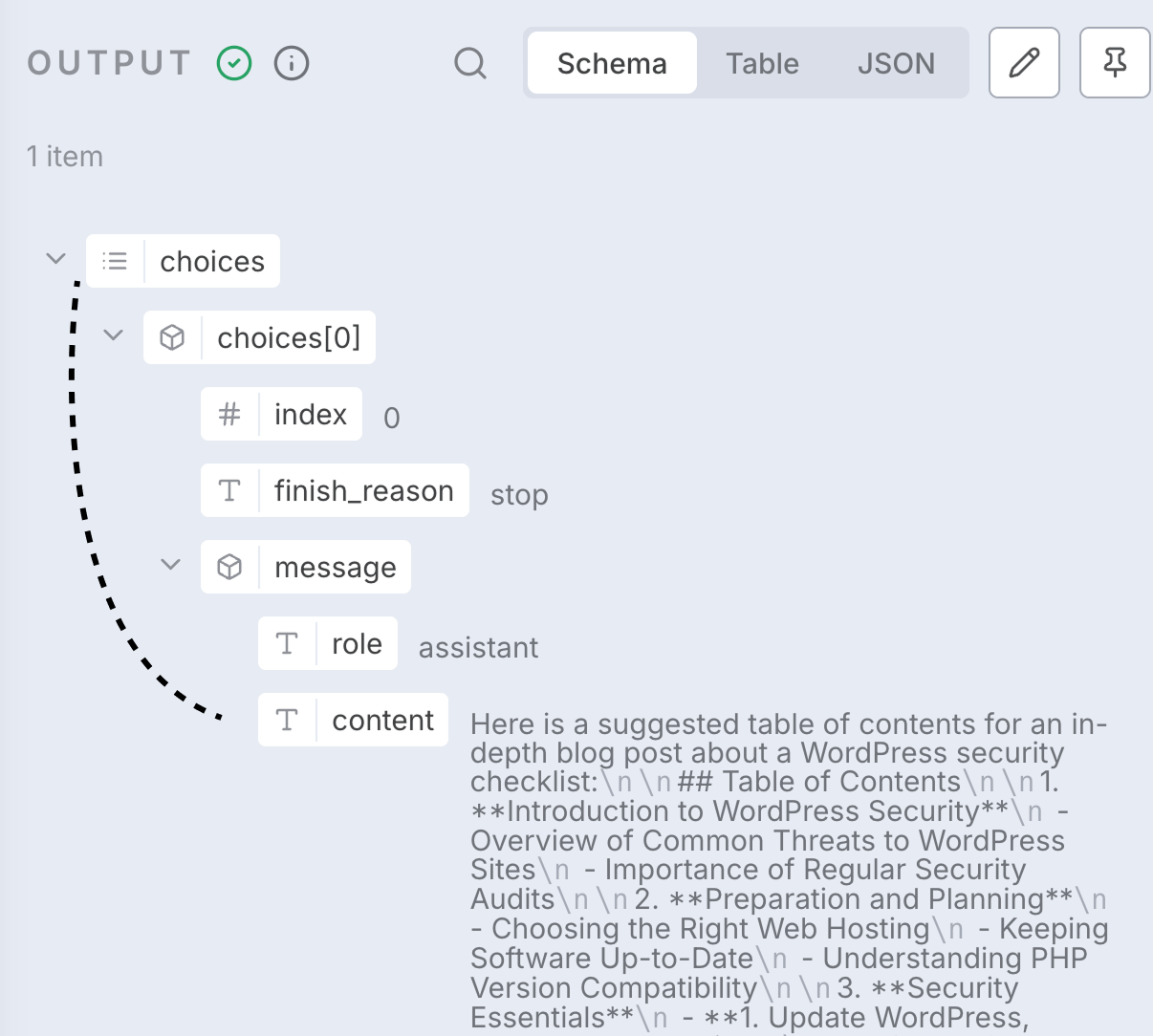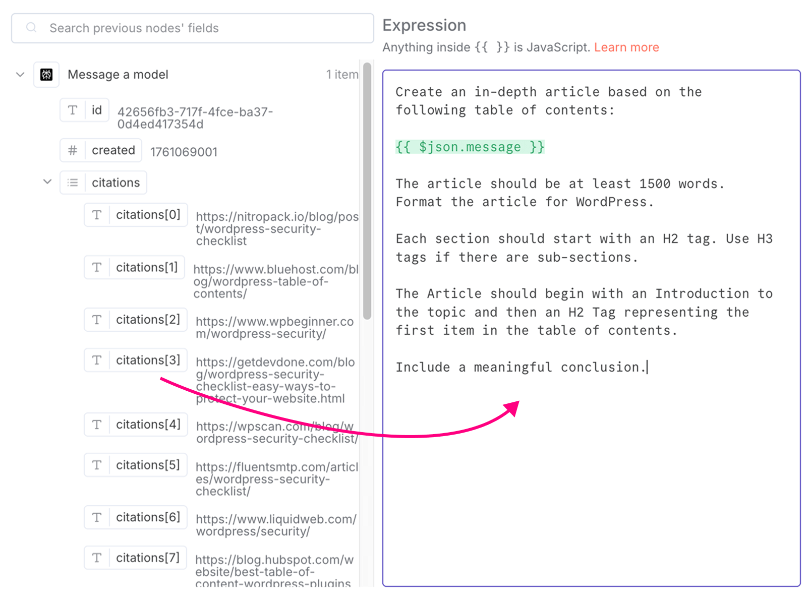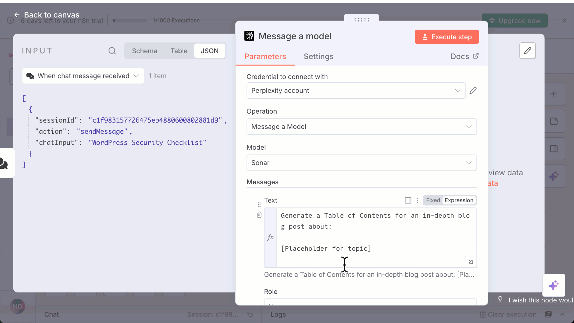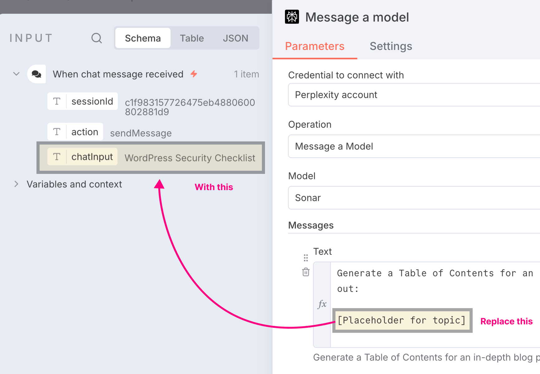 And if you remember, the Perplexity node expects us to provide a topic so it can generate a table of contents for the article.