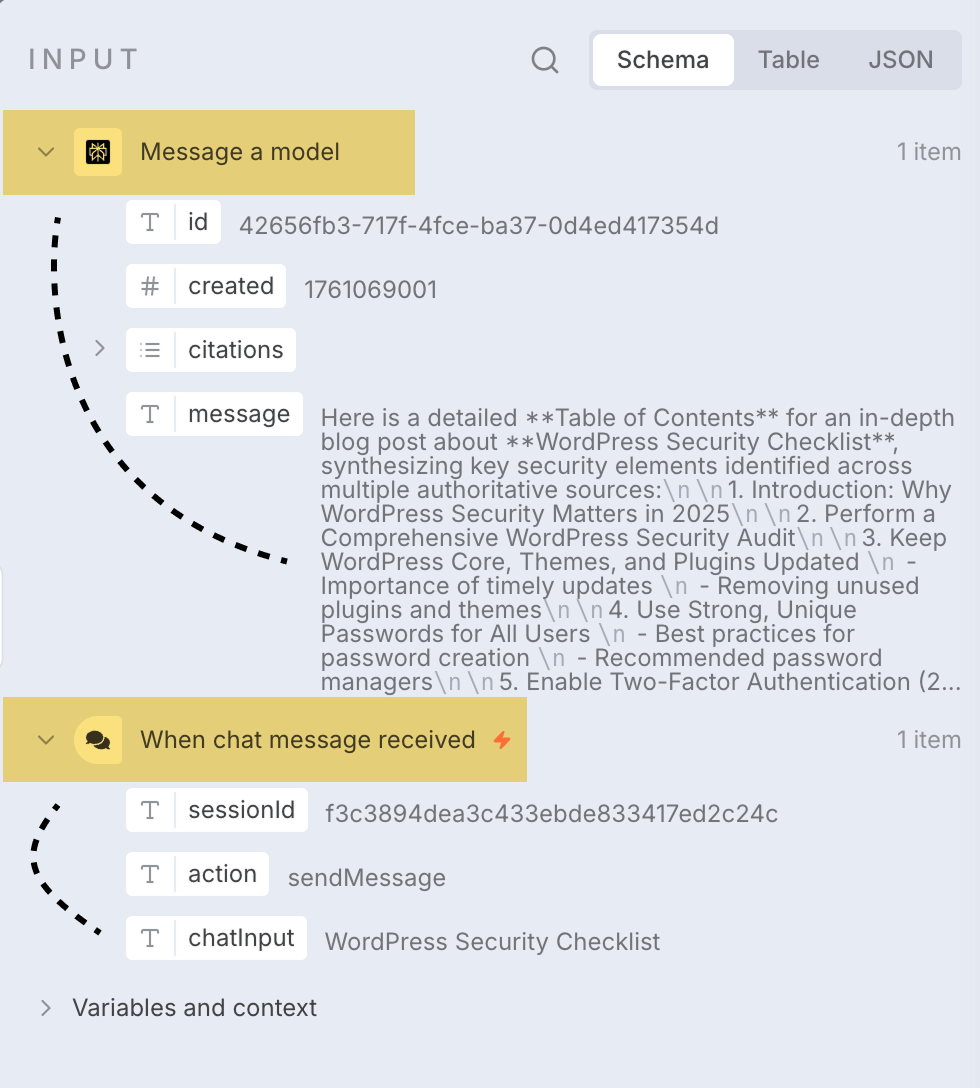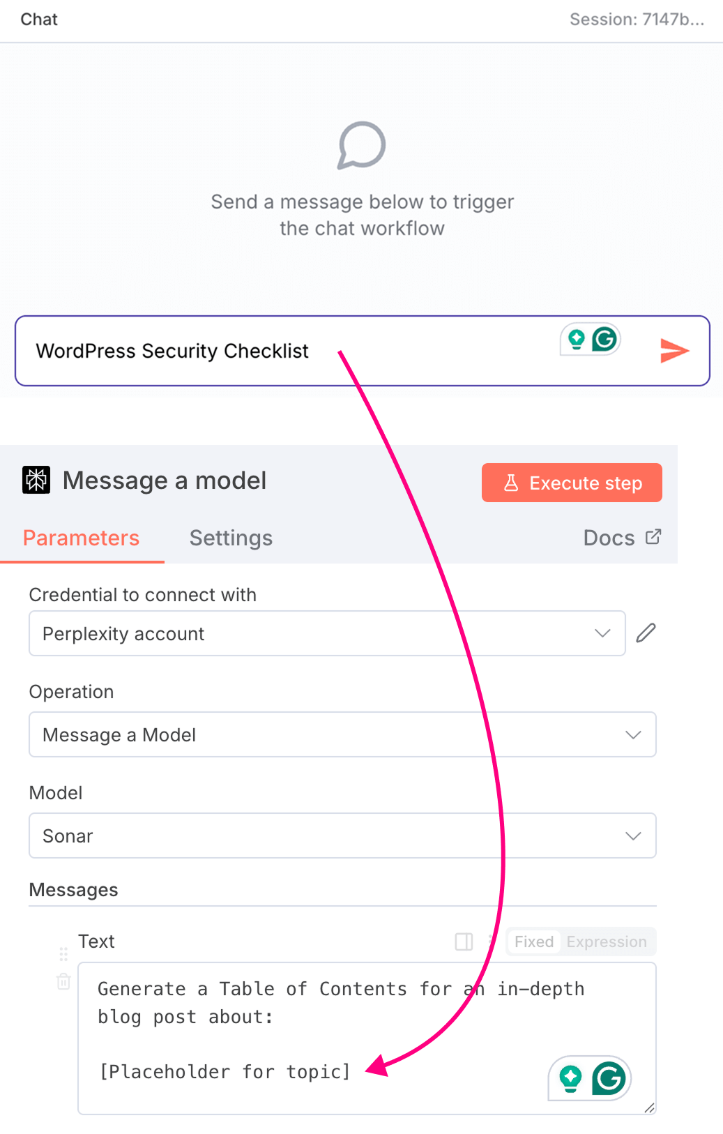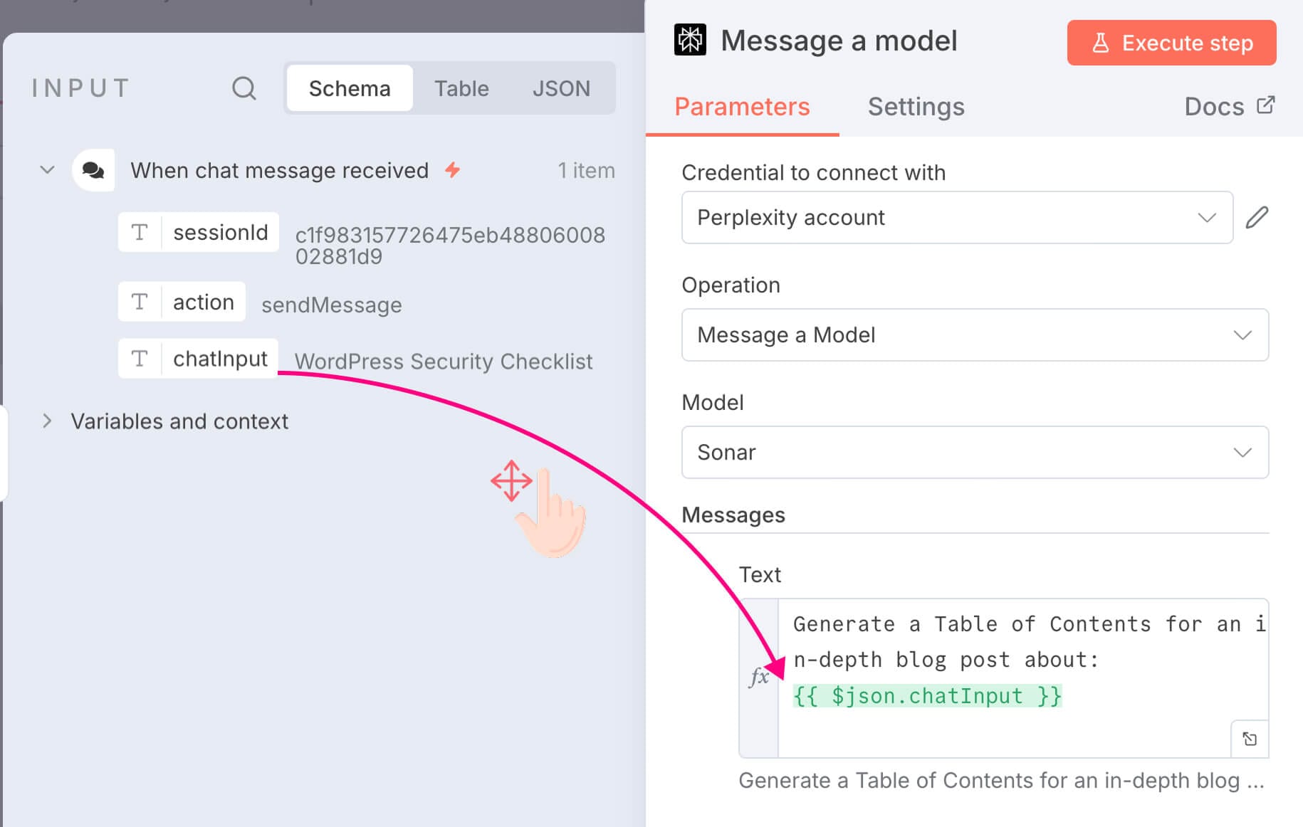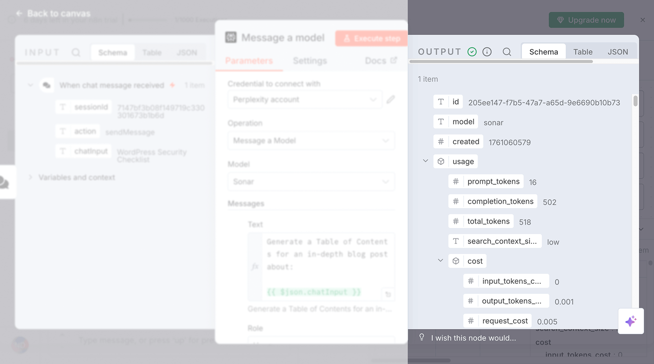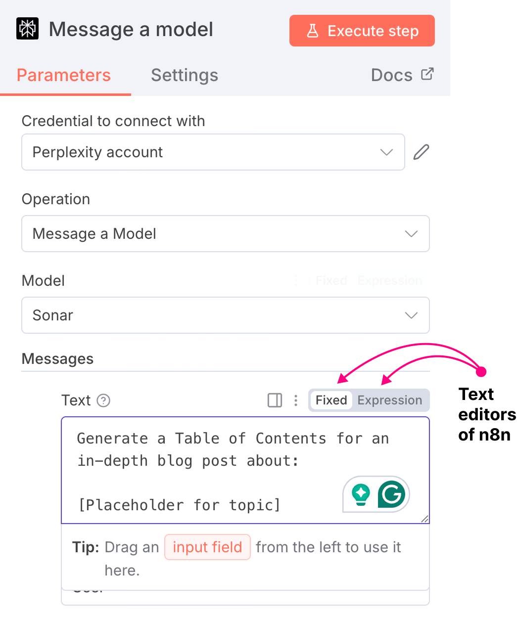And if you remember, the Perplexity node expects us to provide a topic so it can generate a table of contents for the article.