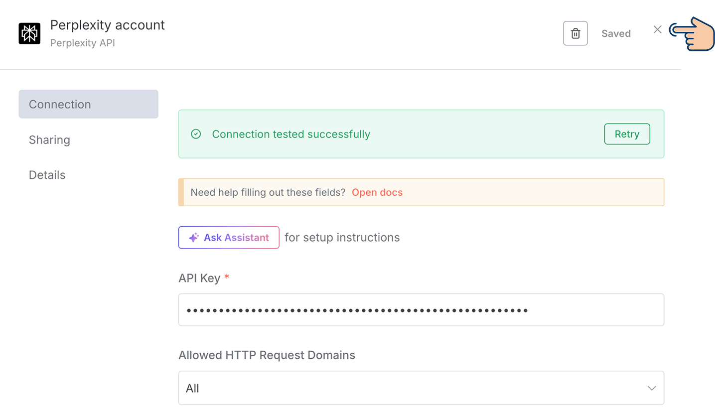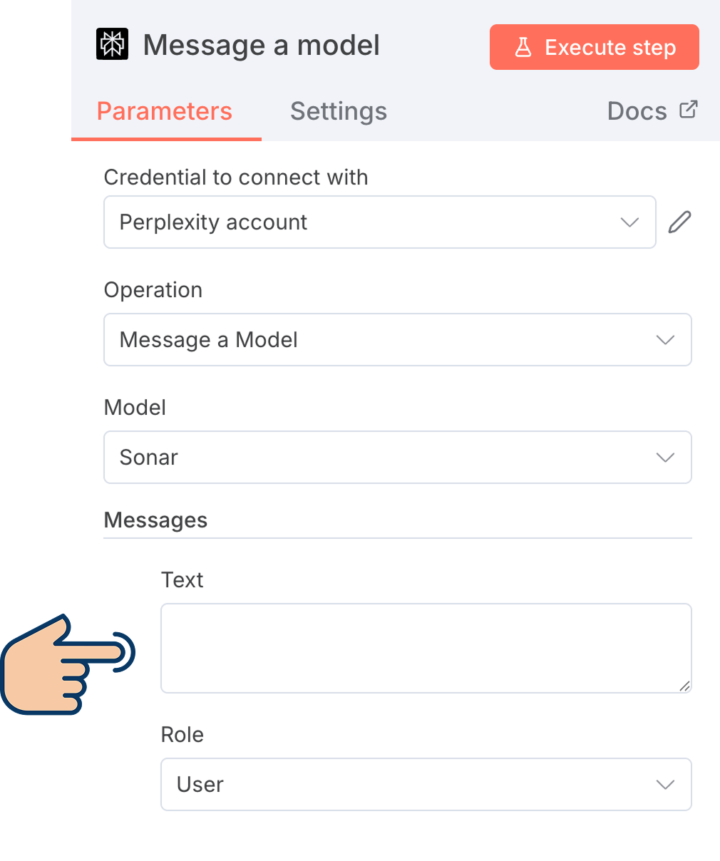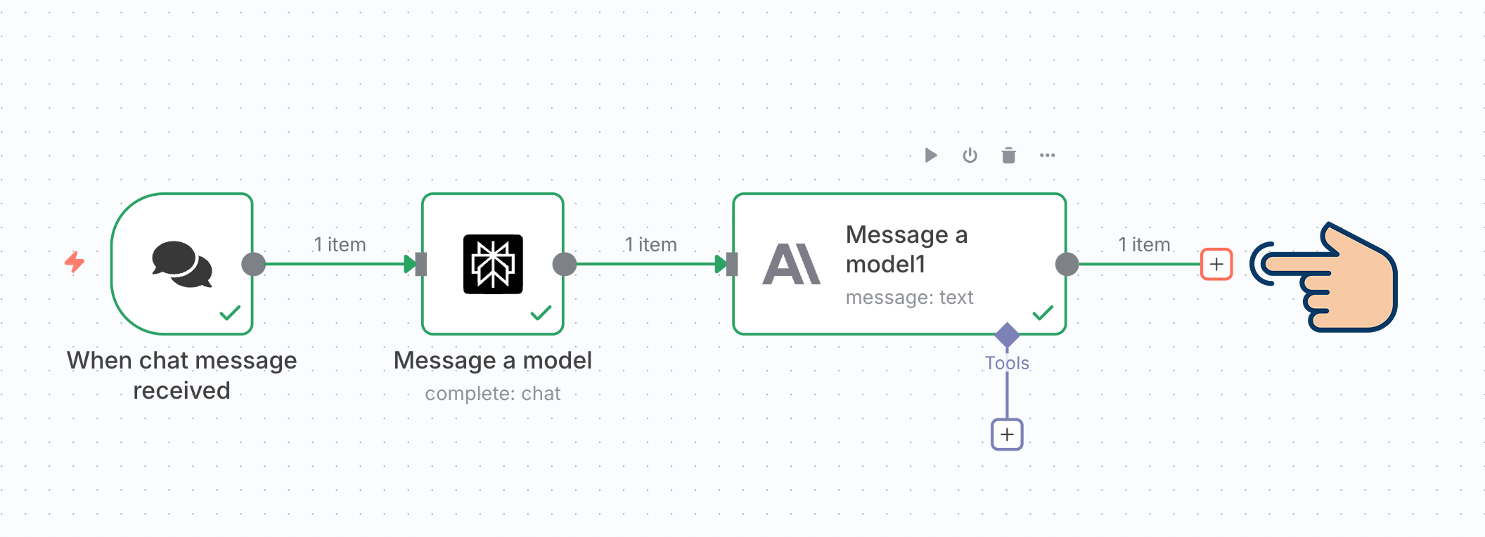 - Put your cursor on the connector line located between the manual trigger and the Perplexity node