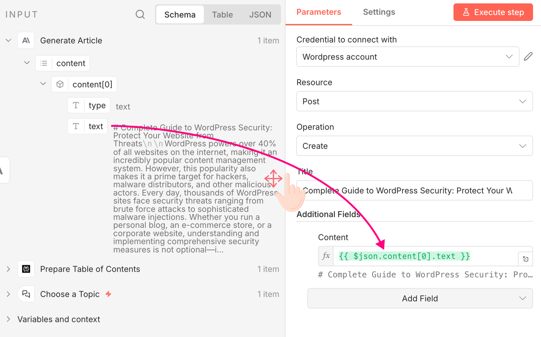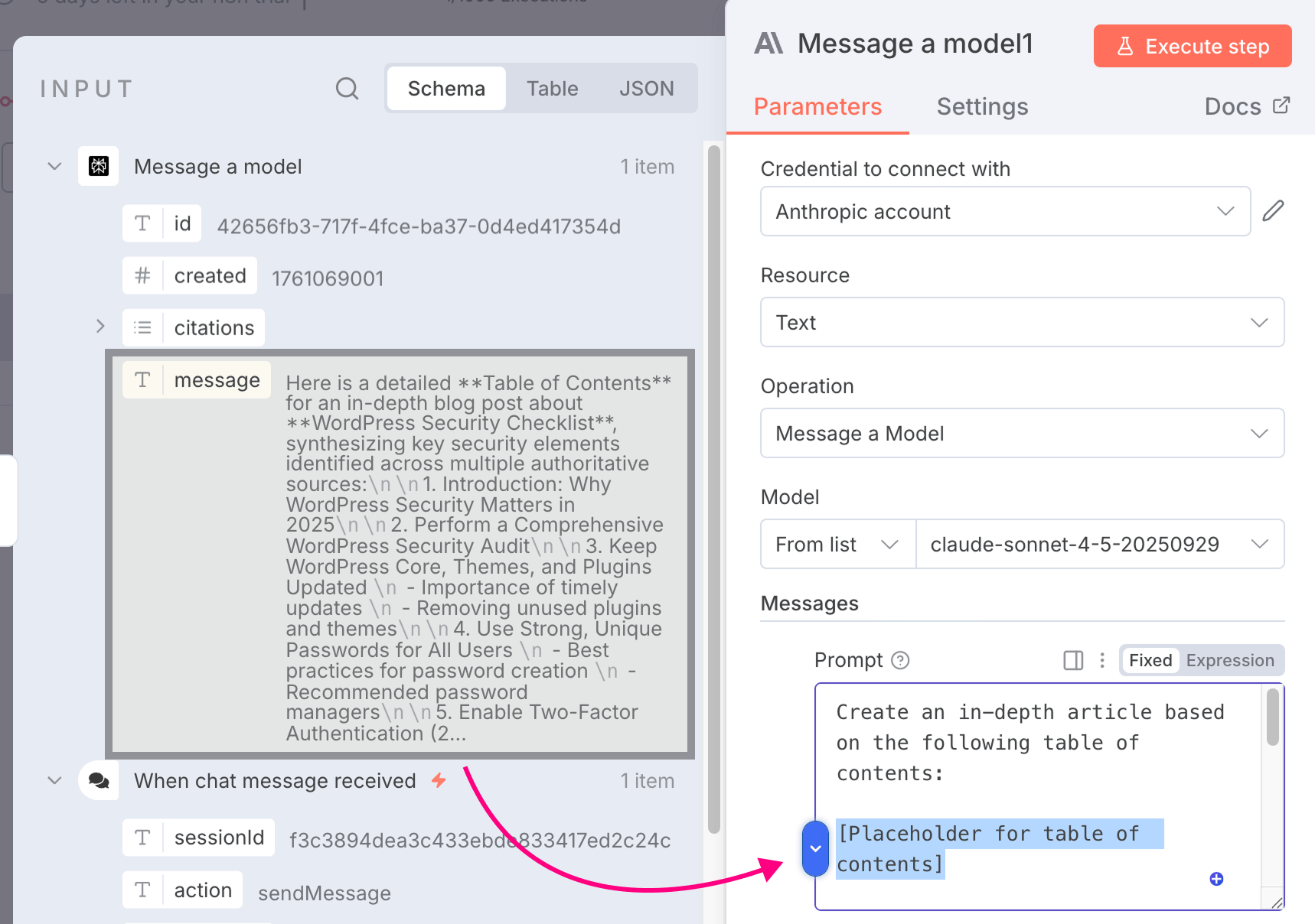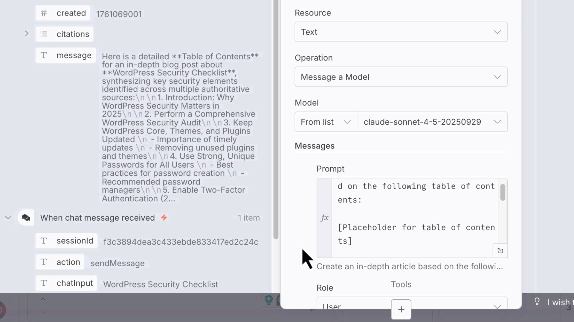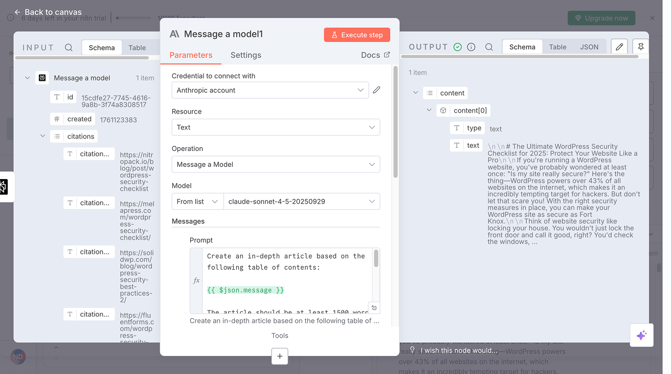 The Challenge: Generate a unique title for each article generated by Claude and use it dynamically inside the WordPress node