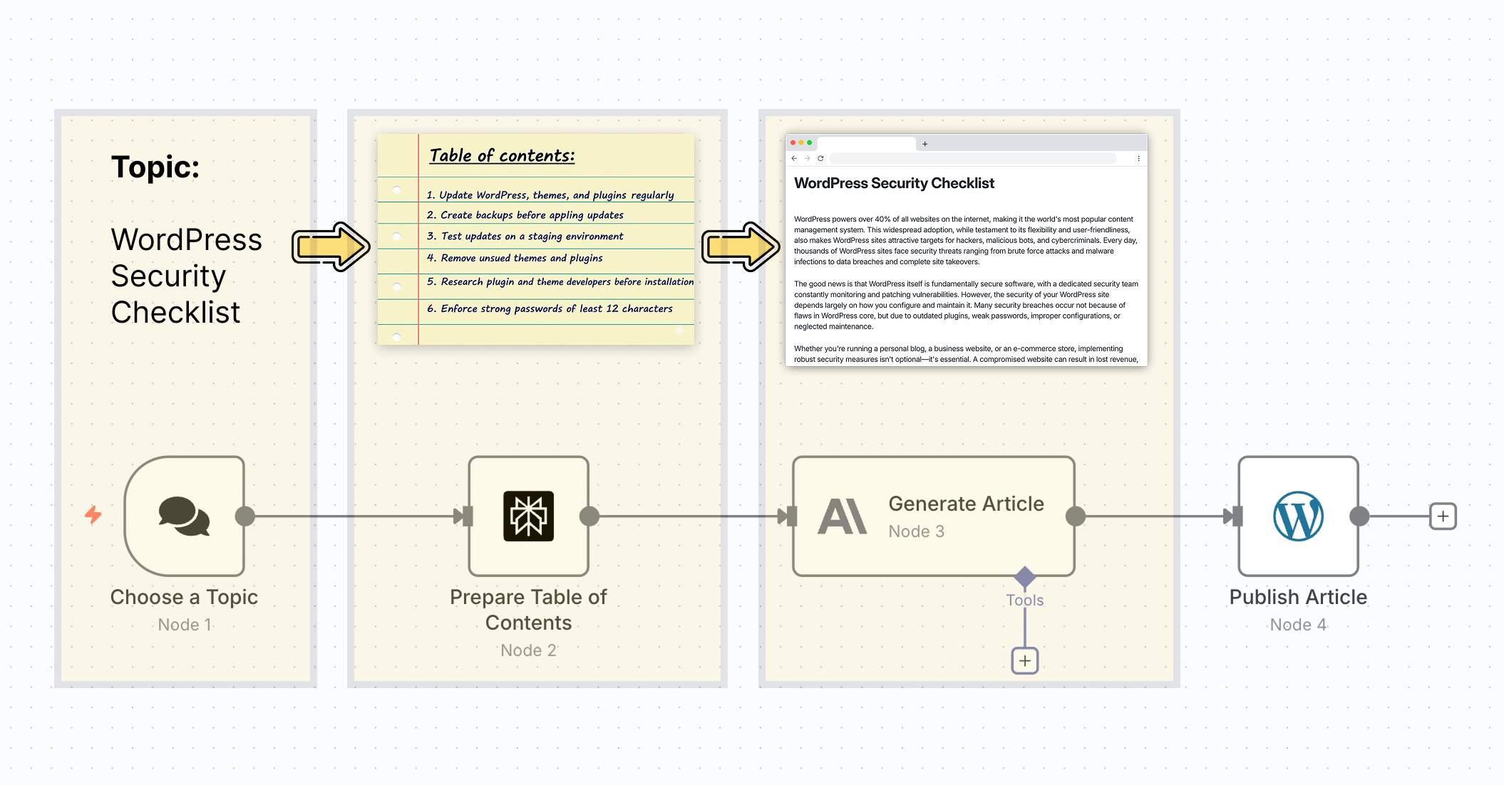 - Next, the topic from node 1 and the table of contents from node 2 are sent to node 3, where it generates the article based on these inputs.