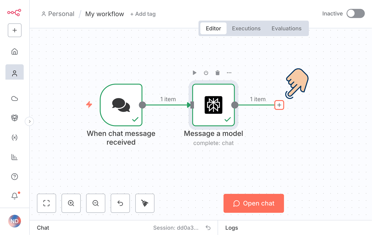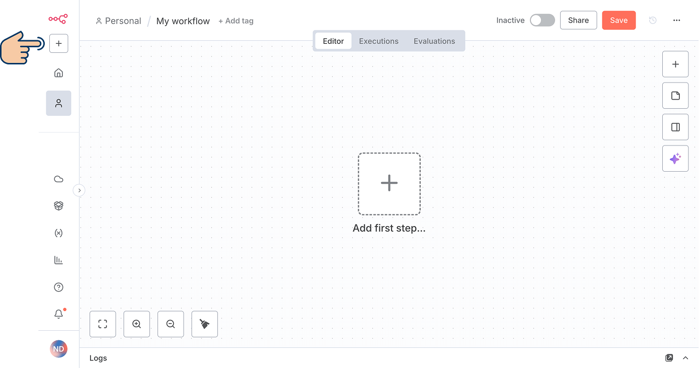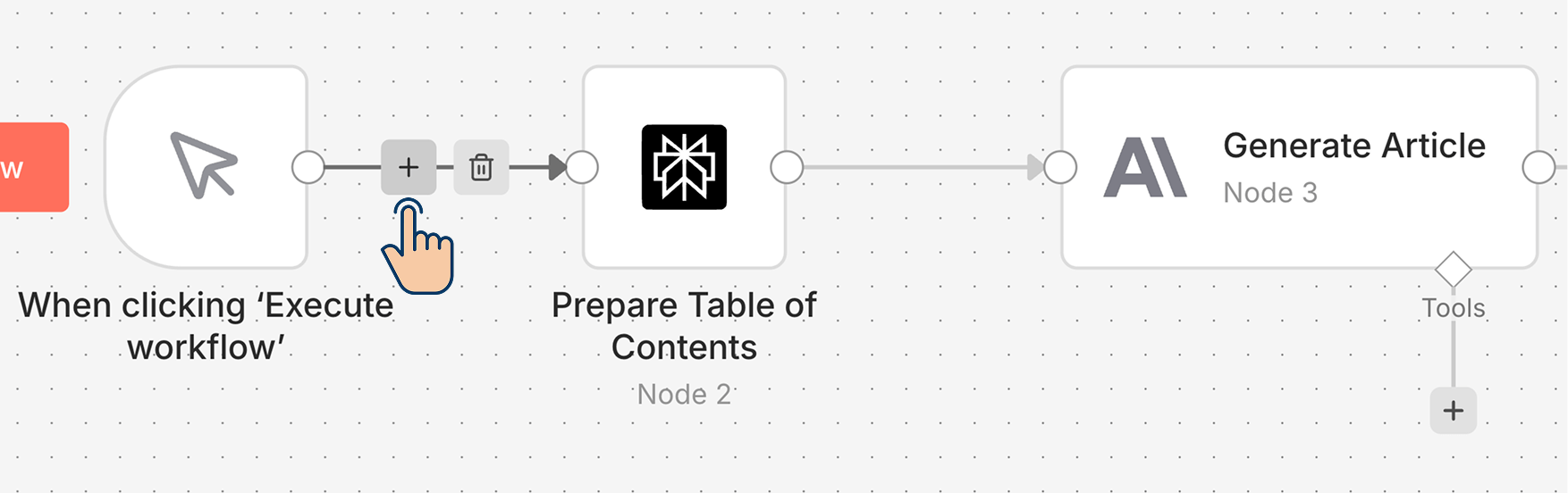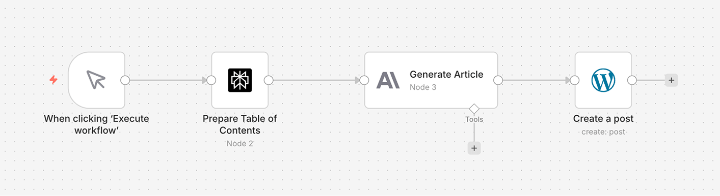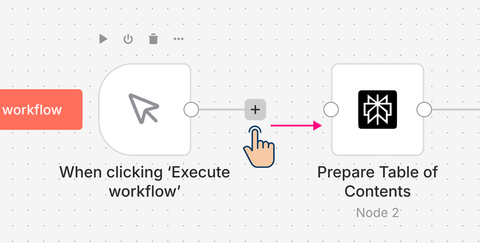 Inside n8n, each step of a workflow is performed by adding a node to the automation pipeline