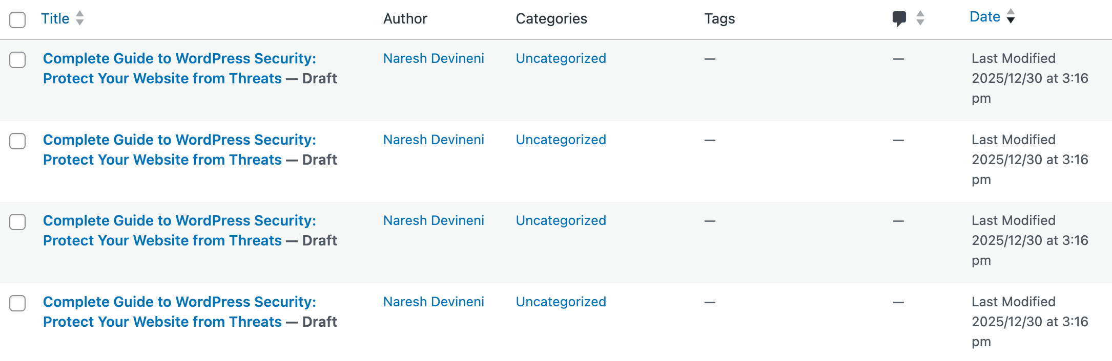 - Finally, all four articles will be posted to the WordPress site as drafts.