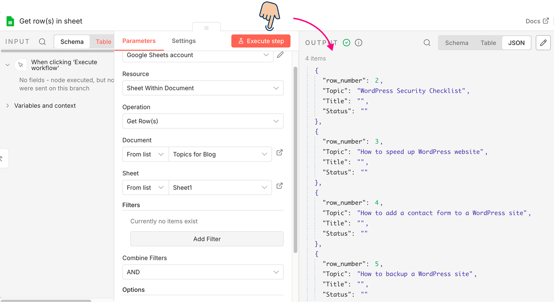 If we now click the "Execute Step" button on the Google Sheets node, you should see the topic data in the node's output panel: