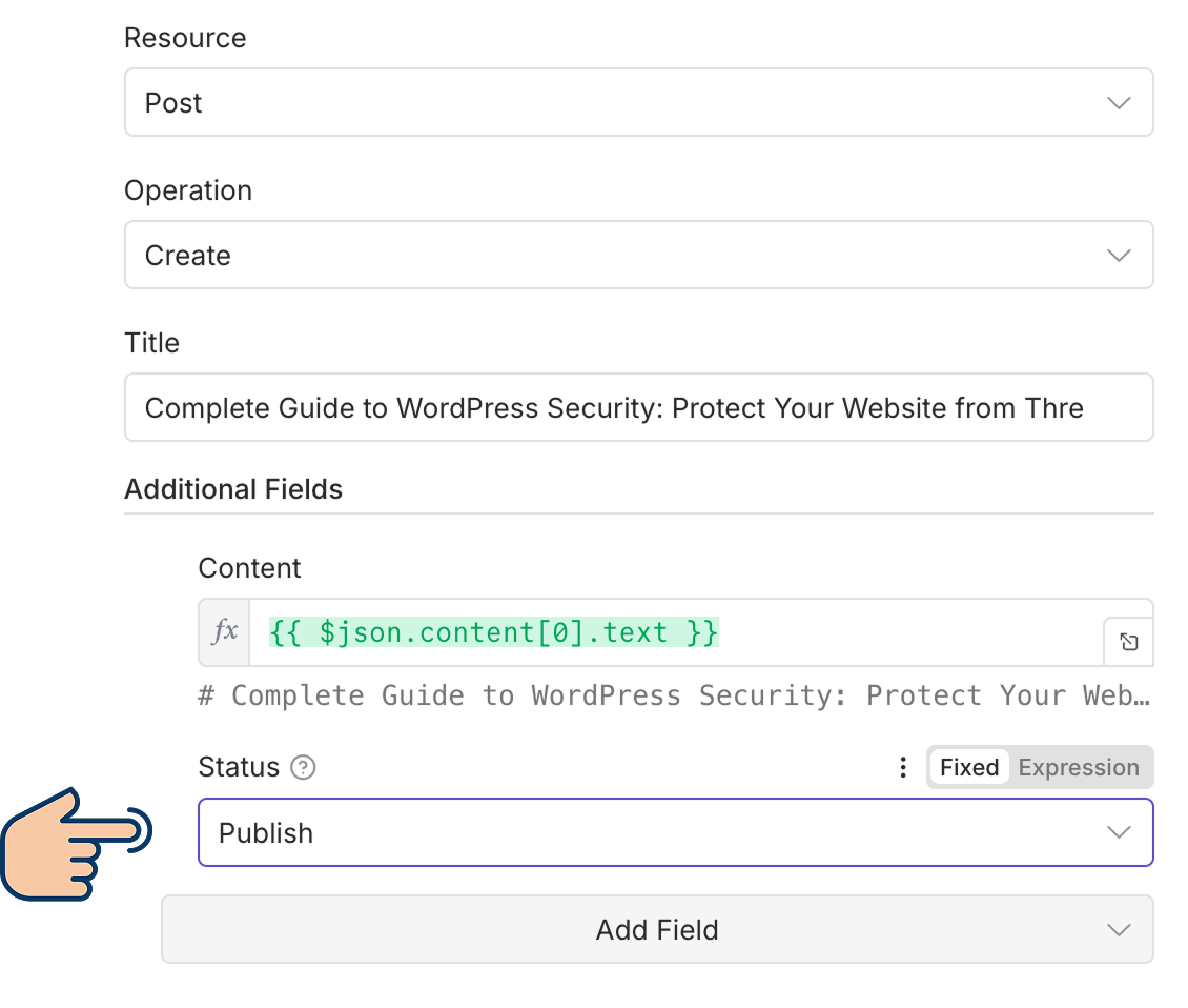 But if you want to publish the post directly for whatever reason, we need to add one more field called "Status" and set it to "Publish".