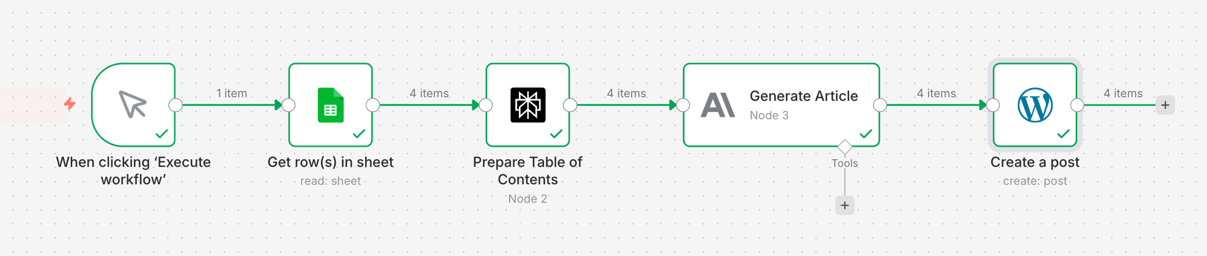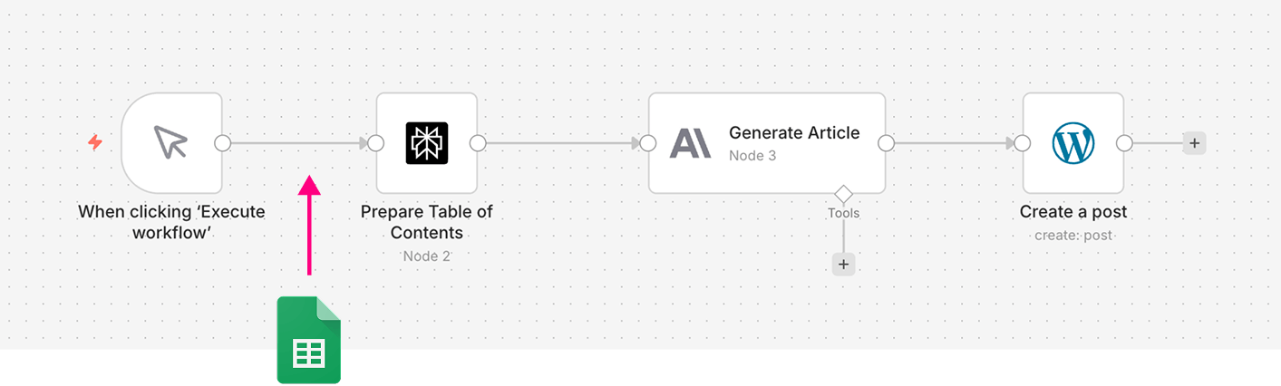 So, right after the manual trigger, we need to retrieve topics from our spreadsheet and provide them as input to the Perplexity node one by one.
