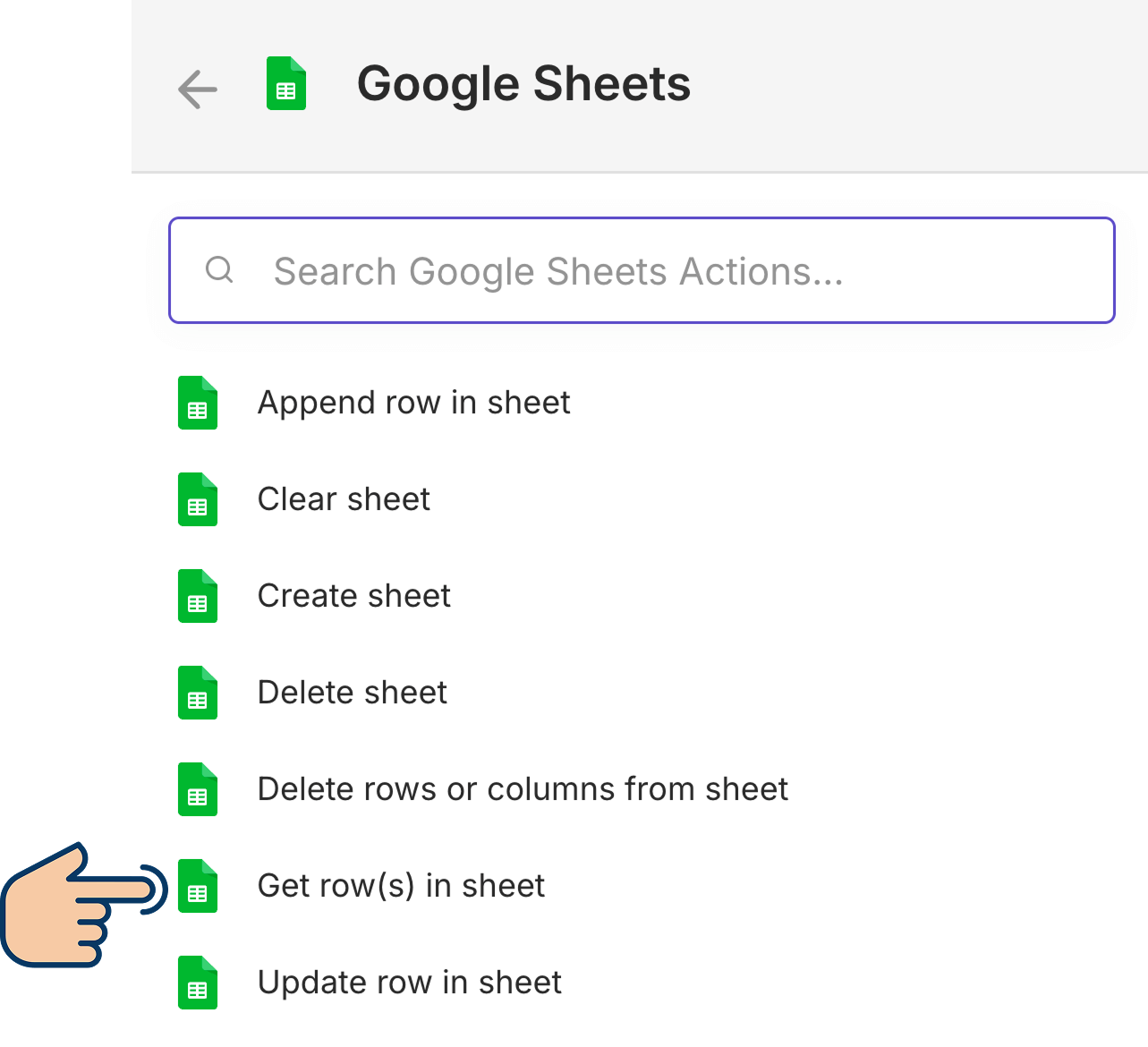 So, search for the "Get Row(s) in sheet" node and add it to our automation: